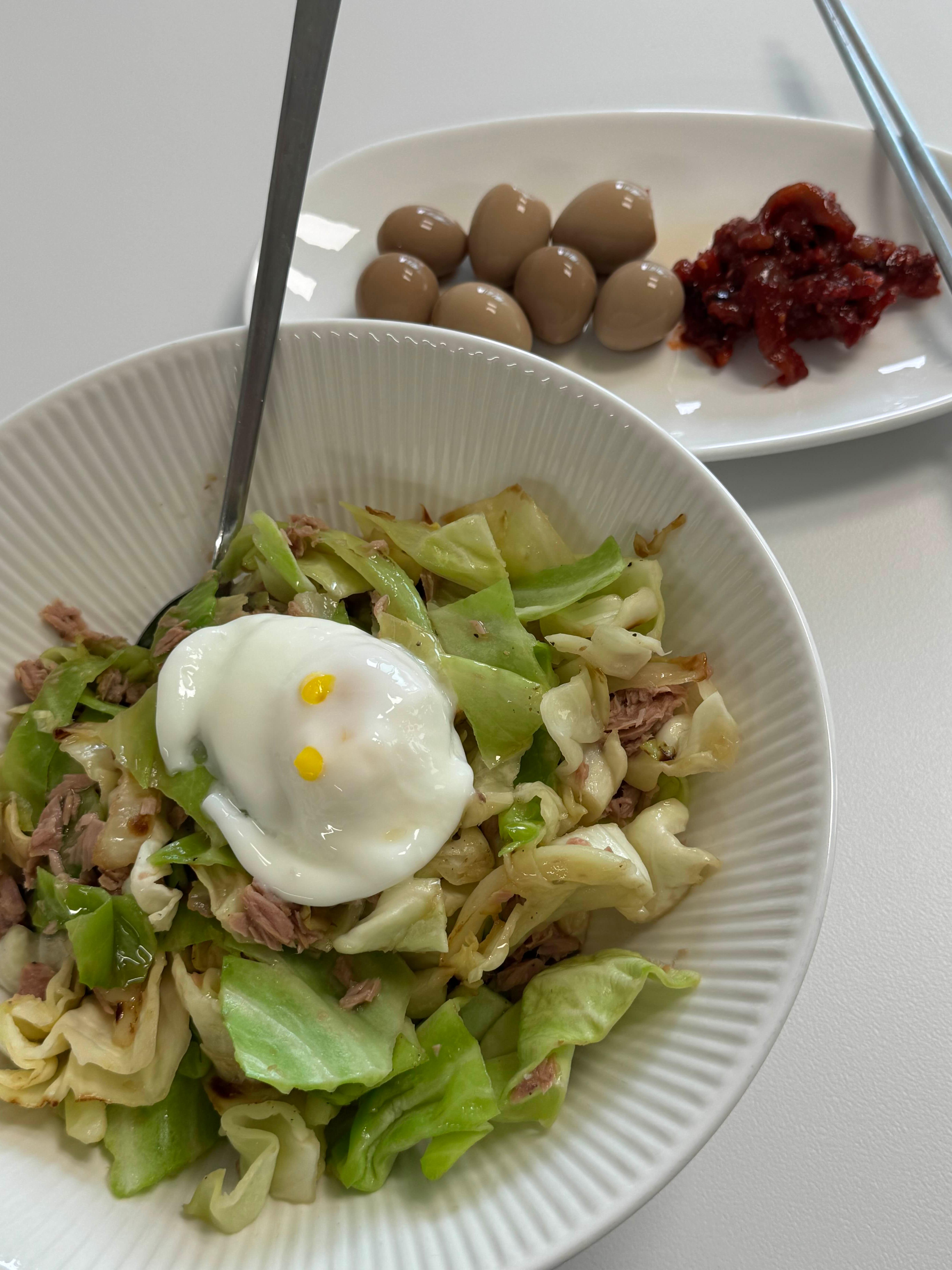 - 그릇에 밥을 담고 위에 양배추 참치를 얹어 완성.